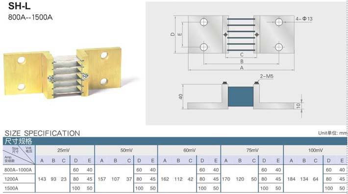 ◆主要技术参数: 1)生产范围: 1A~50A 10mV~800mV; 51A~2500A 10mV~300mV; 2).环境条件:-25~+40℃,相对湿度:≤80%。 3).温升:额定电流下持续2小时温升变化趋于稳定后,额定电流100A以下不超过80K;额定电流100A以上温升不超过120K。 4).过负载性能:120%额定电流值,2小时。 5) .热电势影响:不超过等级指数的50%。