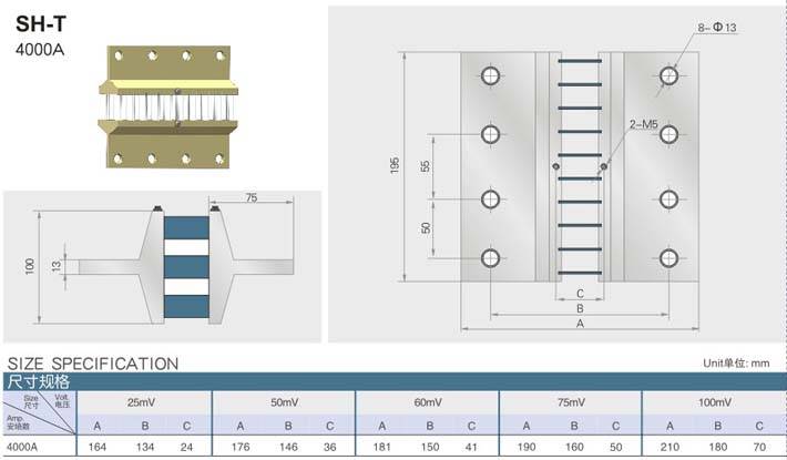 ◆主要技术参数: 1)生产范围: 1A~50A 10mV~800mV; 51A~2500A 10mV~300mV; 2501A~12000A 10mV~100mV 2).环境条件:-25~+40℃,相对湿度:≤80%。 3).温升:额定电流下持续2小时温升变化趋于稳定后,额定电流100A以下不超过80K;额定电流100A以上温升不超过120K。 4).过负载性能:120%额定电流值,2小时。 5) .热电势影响:不超过等级指数的50%。
