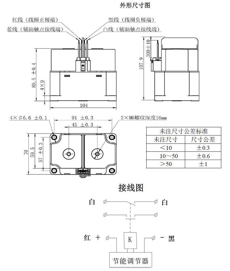 注:产品主触头无极性;线圈红线接正极,黑线接负极;辅助触点无极性接白线。