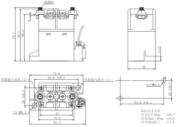 1、产品主触头按接线柱旁边标示“1+”的连接负载“+”端,接线柱旁边的标示“2-”的连接负载 “-”端