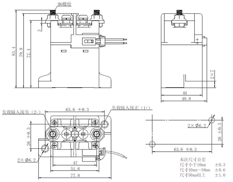 1、产品主触头按接线柱旁边标示“1+”的连接负载“+”端,接线柱旁边的标示“2-”的连接负载 “-”端