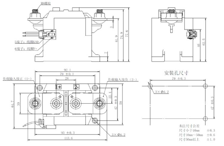 1、产品主触头按接线柱旁边标示“1+”的连接负载“+”端,接线柱旁边的标示“2-”的连接负载 “-”端
