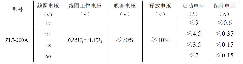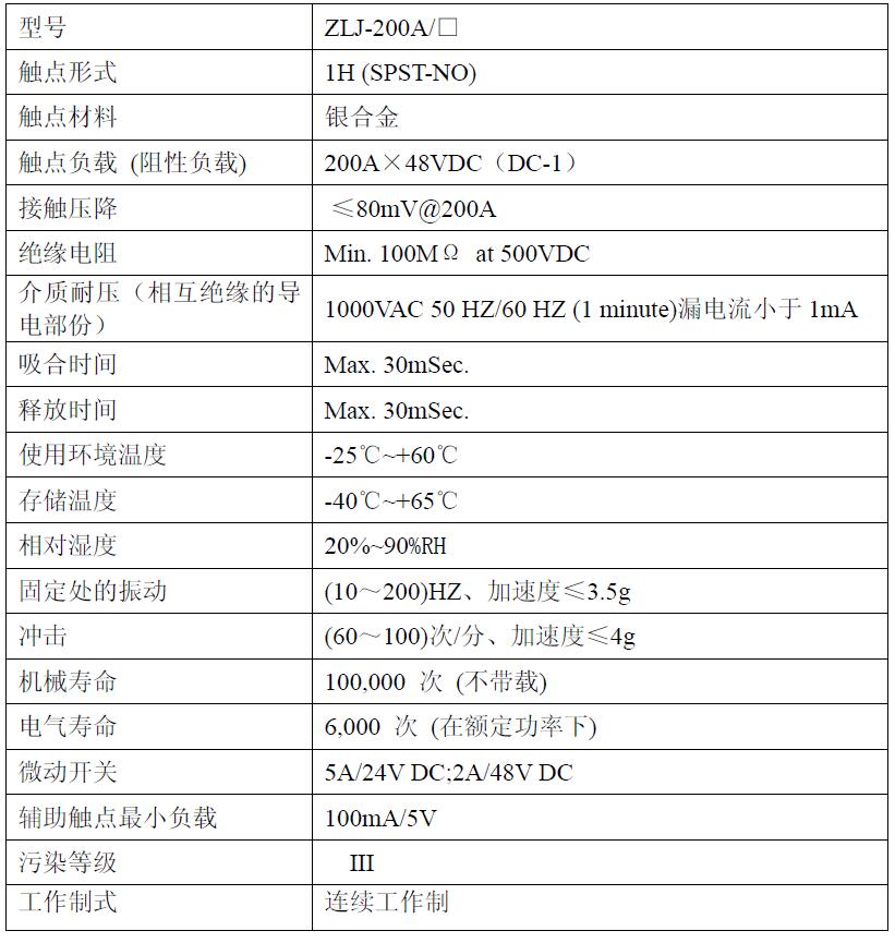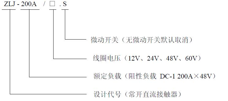 例:ZLJM-200A/48.S;表示:常开接触器,DC-1 负载下额定电流为200A,线圈电压DC48V