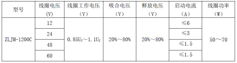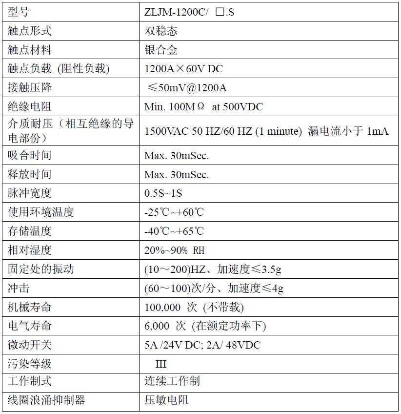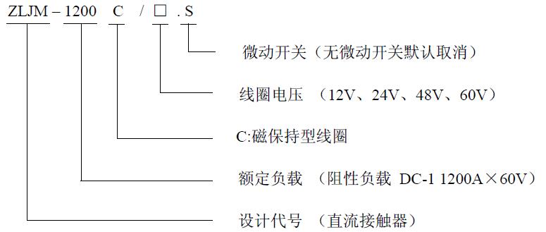 例:ZLJM-1200A/48.S;表示:常开接触器,DC-1 负载下额定电流为1200A,线圈电压DC48V ,带辅