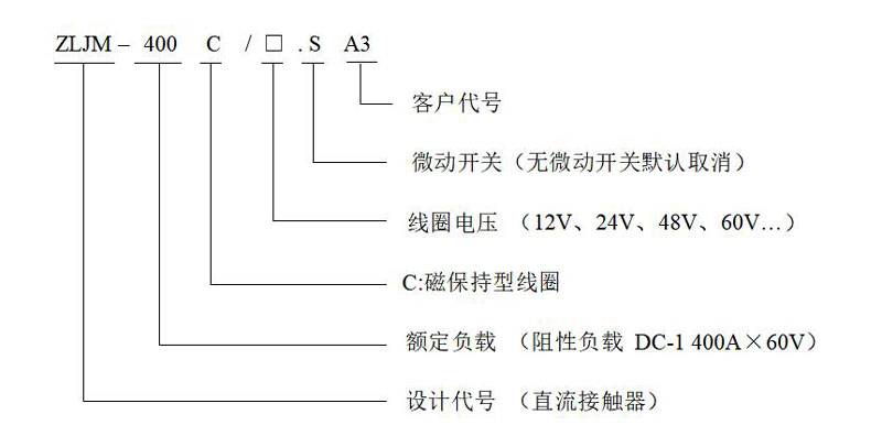 例:ZLJM-400C/48.S A3;表示:磁保持直流接触器,DC-1负载下额定电流为400A,线圈电压DC48V ,带辅助回路微动开关。