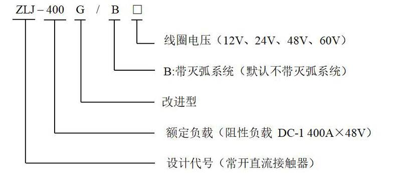 例:ZLJ-400G/48;表示:常开直流接触器,DC-1负载下额定电流为400A,线圈电压DC48V 。